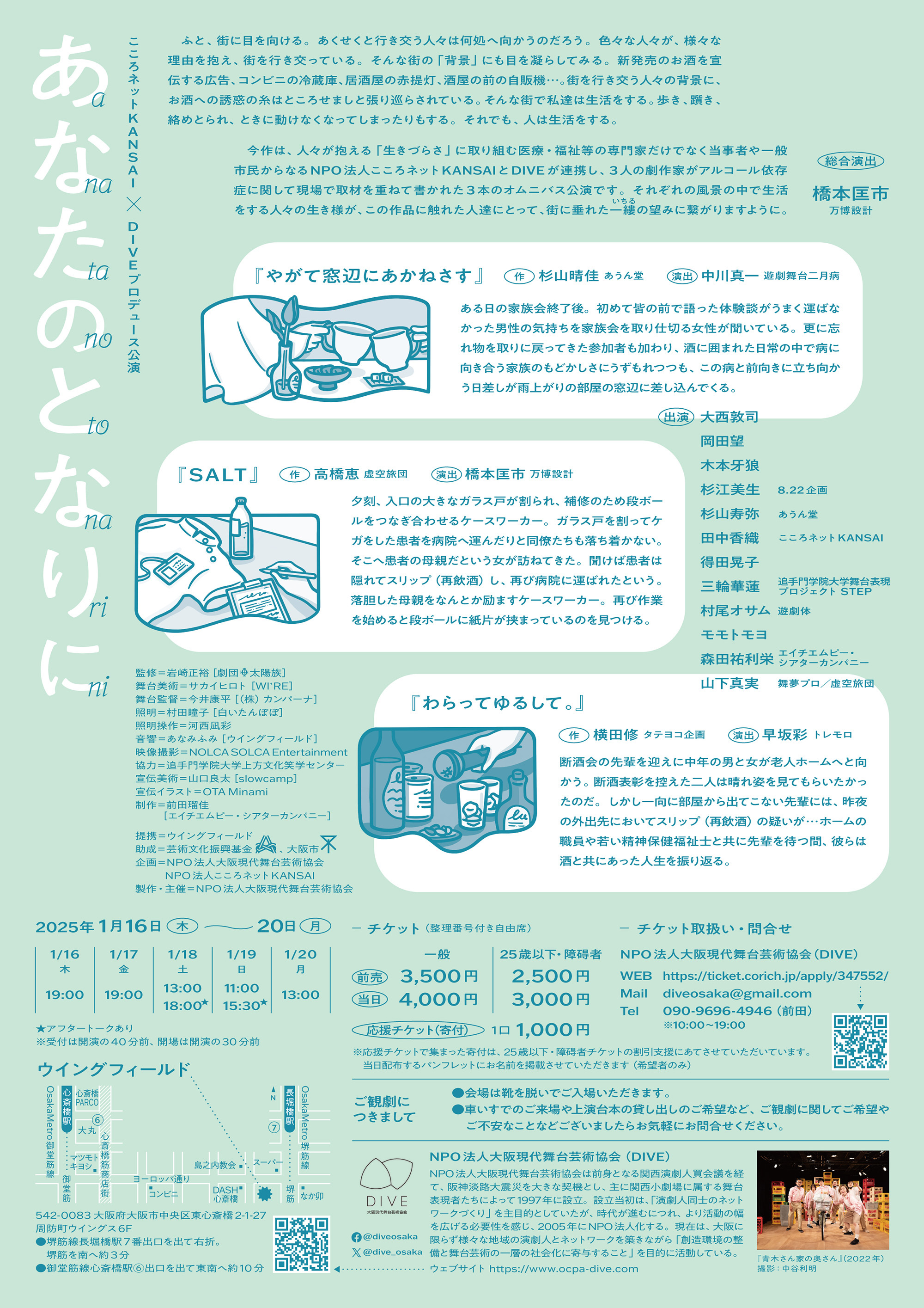 ふと、街に目を向ける。あくせくと行き交う人々は何処へ向かうのだろう。色々な人々が、様々な理由を抱え、街を行き交っている。そんな街の「背景」にも目を凝らしてみる。新発売のお酒を宣伝する広告、コンビニの冷蔵庫、居酒屋の赤提灯、酒屋の前の自販機…。街を行き交う人々の背景に、お酒への誘惑の糸はところせましと張り巡らされている。そんな街で私達は生活をする。歩き、躓き、絡めとられ、ときに動けなくなってしまったりもする。それでも、人は生活をする。今作は、人々が抱える「生きづらさ」に取り組む医療・福祉等の専門家だけでなく当事者や一般市民からなるNPO法人こころネットKANSAIとDIVEが連携し、三人の劇作家がアルコール依存症に関して現場で取材を重ねて書かれた三本のオムニバス公演です。それぞれの風景の中で生活をする人々の生き様が、この作品に触れた人達にとって、街に垂れた一縷の望みに繋がりますように。