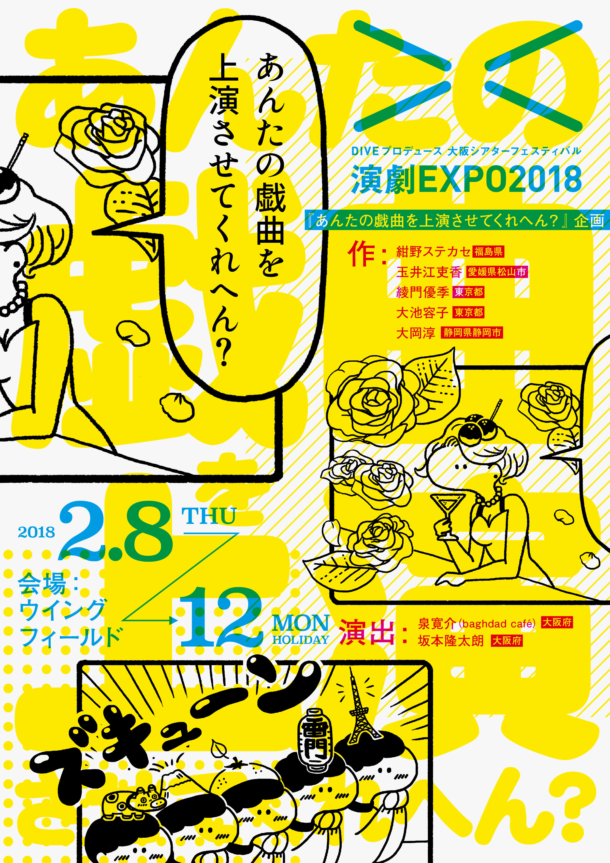 2017年2月、他地域の俳優と関西の演出家と共同制作を行ったNPO法人大阪現代舞台芸術協会(DIVE)。2018年は他地域の劇作家と関西の演出家とのコラボ企画「あんたの戯曲を上演させてくれへん?」を大阪シアターフェスティバル 演劇EXPO2018にて開催します。