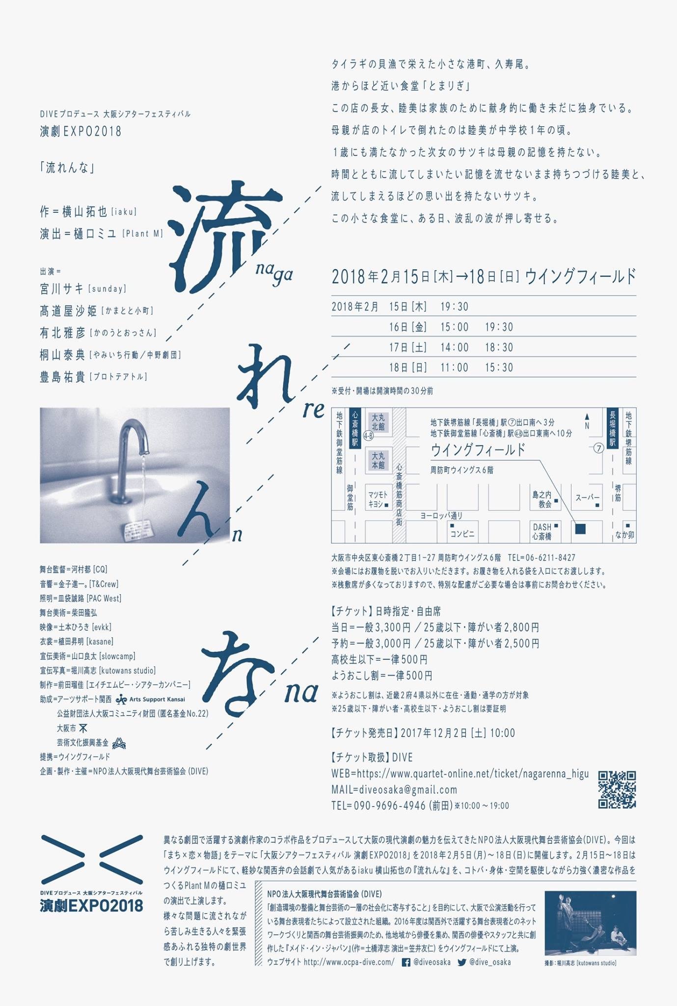 異なる劇団で活躍する演劇作家のコラボ作品をプロデュースして大阪の現代演劇の魅力を伝えてきたNPO法人大阪現代舞台芸術協会(DIVE)。今回は軽妙な関西弁の会話劇で人気があるiaku 横山拓也の『流れんな』を、コトバ・身体・空間を駆使しながら力強く濃密な作品をつくるPlant Mの樋口ミユの演出で上演します。