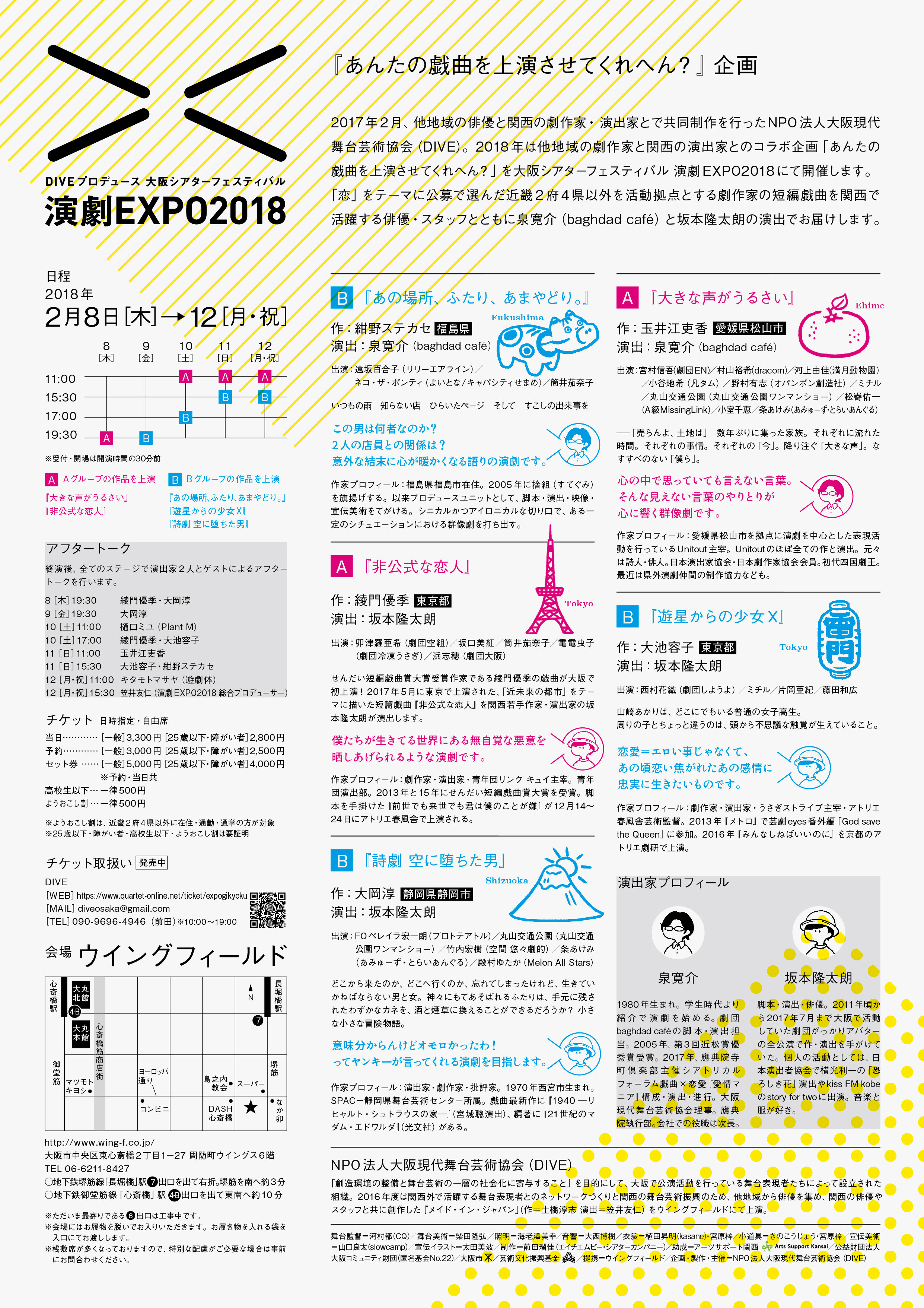 2017年2月、他地域の俳優と関西の演出家と共同制作を行ったNPO法人大阪現代舞台芸術協会(DIVE)。2018年は他地域の劇作家と関西の演出家とのコラボ企画「あんたの戯曲を上演させてくれへん?」を大阪シアターフェスティバル 演劇EXPO2018にて開催します。