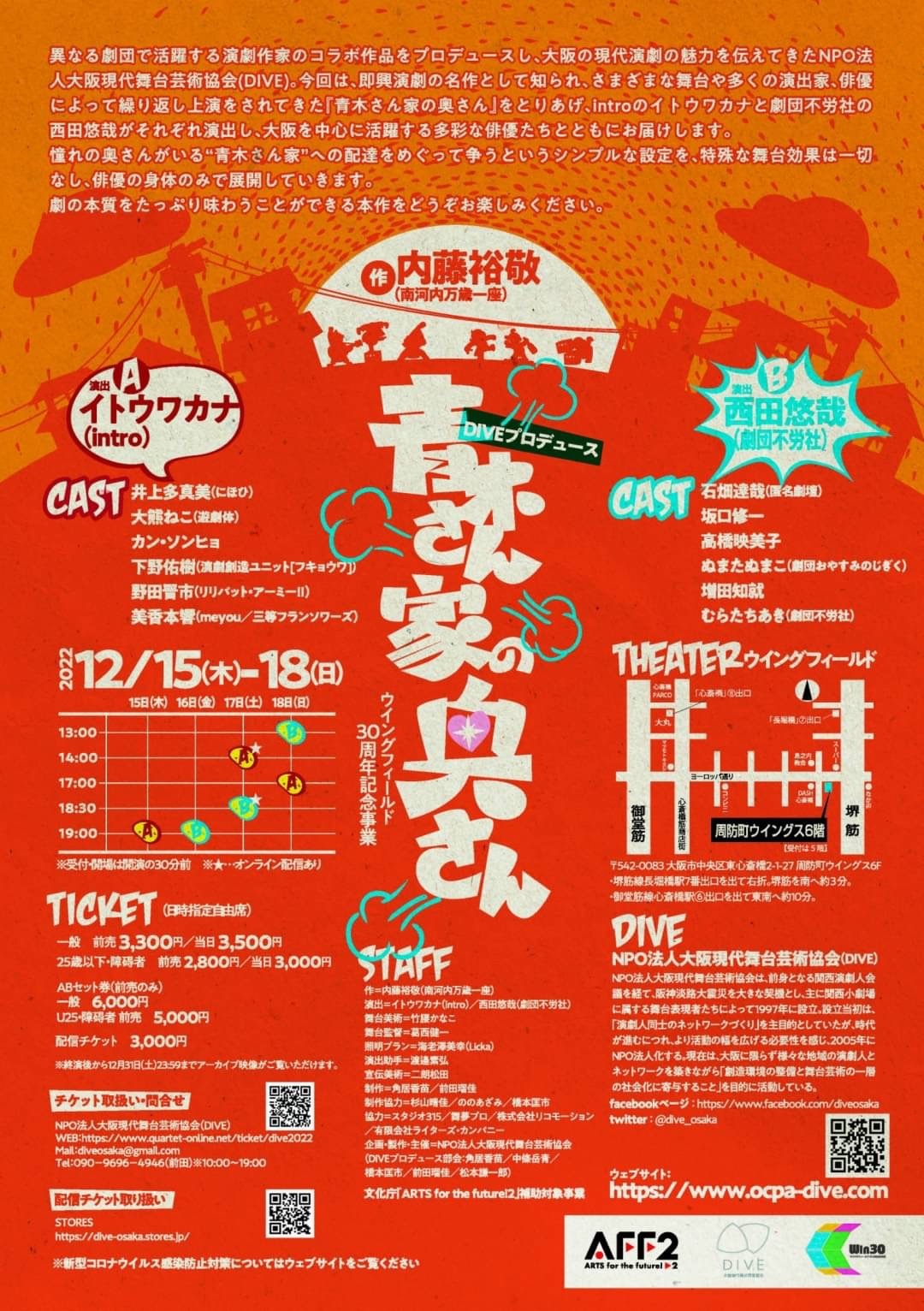 異なる劇団で活躍する演劇作家のコラボ作品をプロデュースし、大阪の現代演劇の魅力を伝えてきたNPO法人大阪現代舞台芸術協会(DIVE)。今回は、即興演劇の名作として知られ、さまざまな舞台や多くの演出家、俳優によって繰り返し上演をされてきた『青木さん家の奥さん』をとりあげ、introのイトウワカナと劇団不労社の西田悠哉がそれぞれ演出し、大阪を中心に活躍する多彩な俳優たちとともにお届けします。