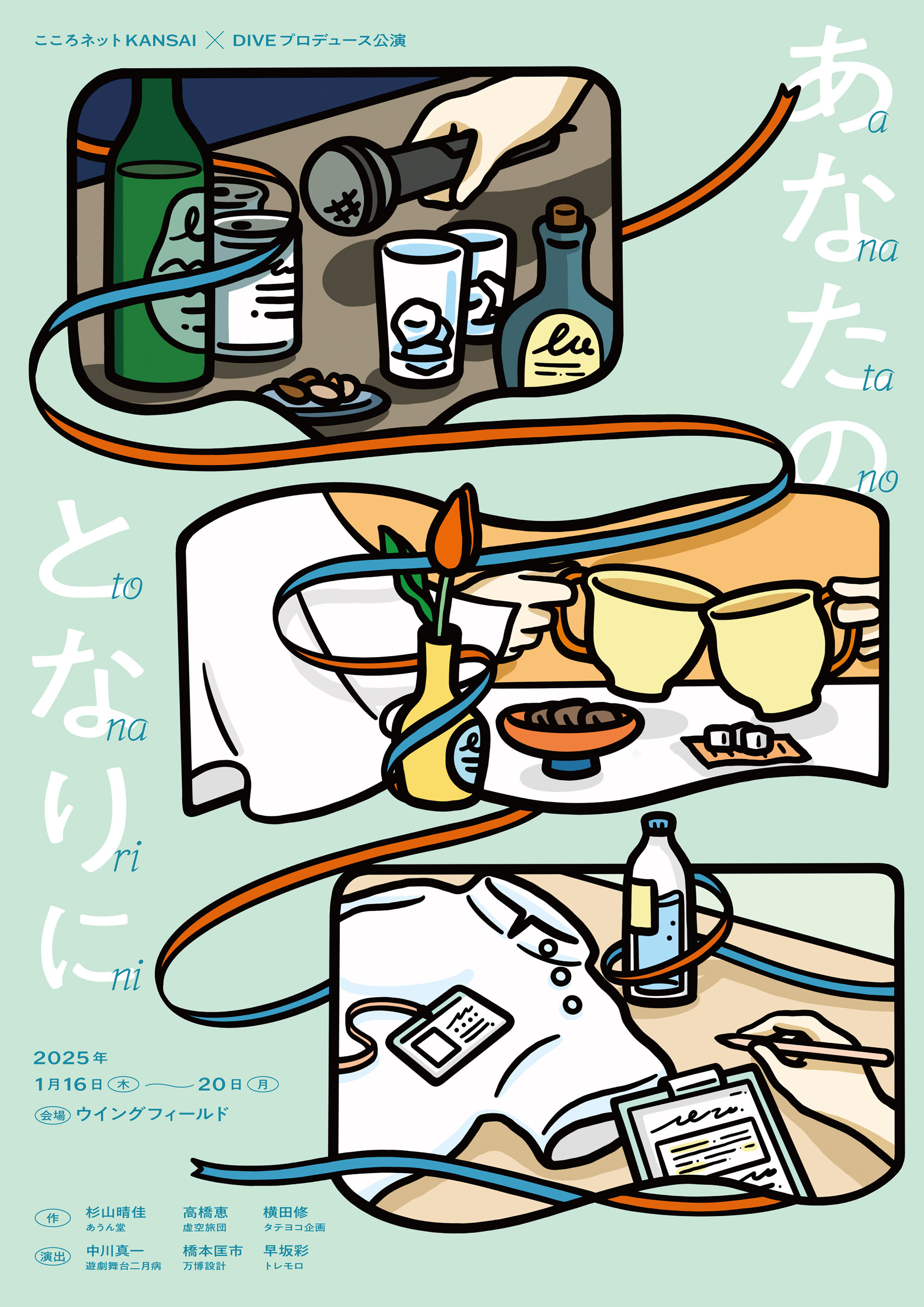 ふと、街に目を向ける。あくせくと行き交う人々は何処へ向かうのだろう。色々な人々が、様々な理由を抱え、街を行き交っている。そんな街の「背景」にも目を凝らしてみる。新発売のお酒を宣伝する広告、コンビニの冷蔵庫、居酒屋の赤提灯、酒屋の前の自販機…。街を行き交う人々の背景に、お酒への誘惑の糸はところせましと張り巡らされている。そんな街で私達は生活をする。歩き、躓き、絡めとられ、ときに動けなくなってしまったりもする。それでも、人は生活をする。今作は、人々が抱える「生きづらさ」に取り組む医療・福祉等の専門家だけでなく当事者や一般市民からなるNPO法人こころネットKANSAIとDIVEが連携し、三人の劇作家がアルコール依存症に関して現場で取材を重ねて書かれた三本のオムニバス公演です。それぞれの風景の中で生活をする人々の生き様が、この作品に触れた人達にとって、街に垂れた一縷の望みに繋がりますように。